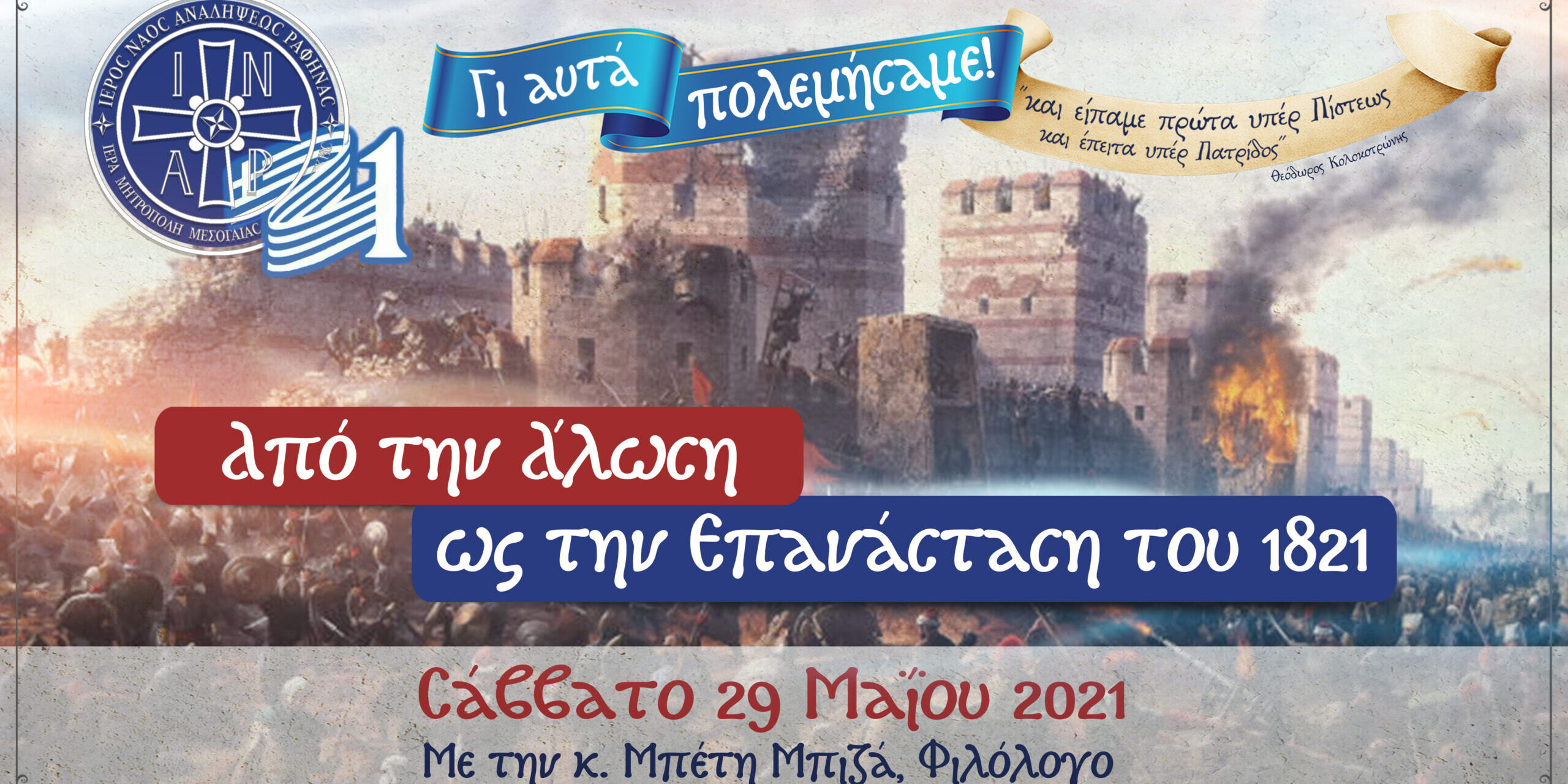 Με αφορμή την θλιβερή επέτειο της Αλώσεως της Κωνσταντινουπόλεως, ο Ι. Ναός μας θα μεταδόσει ομιλία της κ. Μπέτη Μπιζά, φιλολογου, με θέμα το πώς συνδέονται τα δύο αυτά γεγονότα, ιδιαιτέρως φέτος που εορτάζουμε τα 200 χρόνια από την έναρξη της Ελληνικής Επανάστασης.