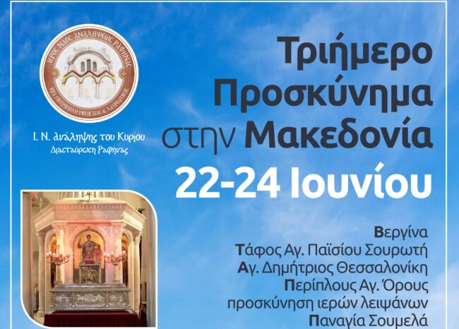 Η Ενορία μας διοργανώνει τριήμερη Προσκυνηματική εκδρομή στην Μακεδονία από 22 έως 24 Ιουνίου 2023 σύμφωνα με το ακόλουθο πρόγραμμα:…
